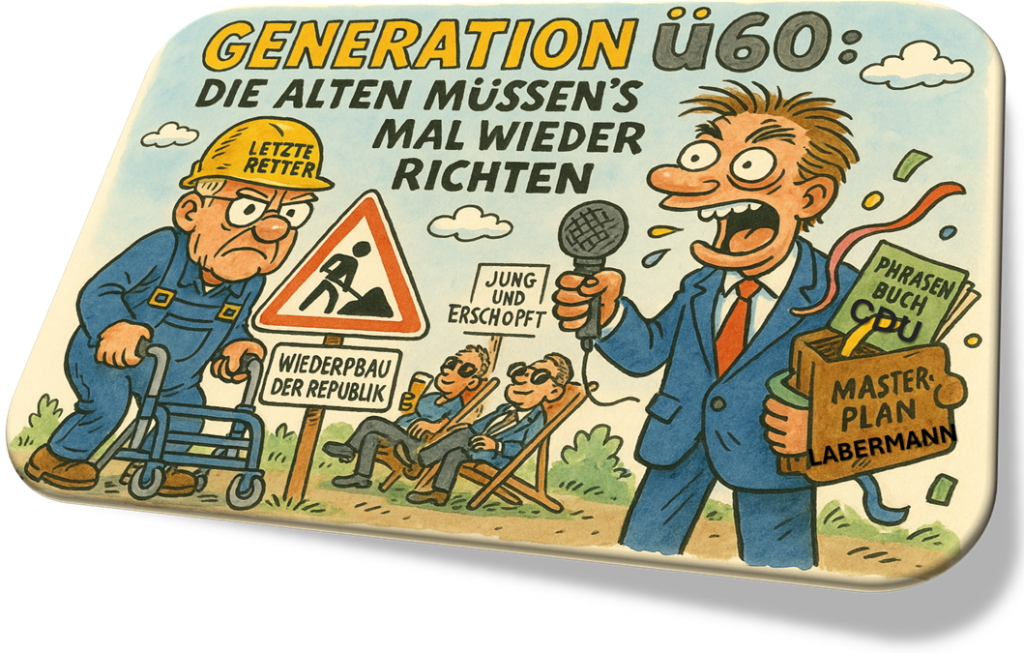 ๐—ฅ๐—ฒ๐—ป๐˜๐—ป๐—ฒ๐—ฟ also โ€“ die letzte Hoffnung einer Politikergarde, die weder rechnen noch denken kann, dafรผr aber umso lauter nach hinten trรคumt. Die Alten sollenโ€™s richten, weil die es ja drauf haben und weil nur sie es kรถnnen. Immerhin brauchen wir ja auch irgendwen, der das Versagen jener inkompetenten Polit-Simulanten ausgleicht, die wie Herr ๐—Ÿ๐—ถ๐—ป๐—ป๐—ฒ๐—บ๐—ฎ๐—ป๐—ป von Talkshow zu Talkshow tingeln, als wรคrโ€™s ein Staffellauf der Einfallslosigkeit.